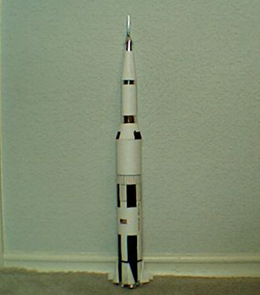 This is a scratch-built model of the NASA Saturn V with Apollo Spacecraft. It was built as a project, teaching my son the use of some basic geometric shapes for paper crafts using construction paper, aluminum tape and pen and ink details.